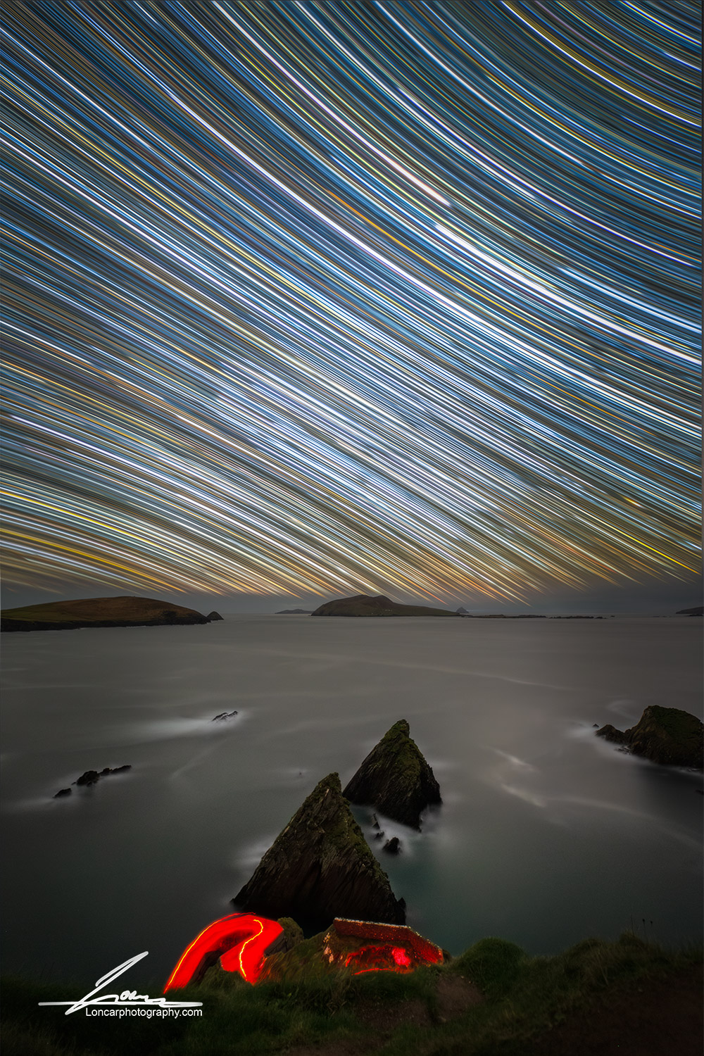 Long exposure photography reveals streaks of light racing across the night sky while waves move gently around the rocky foreground. The distant Blasket Islands sit beneath the motion of the stars, creating depth and drama along Ireland’s wild western edge.