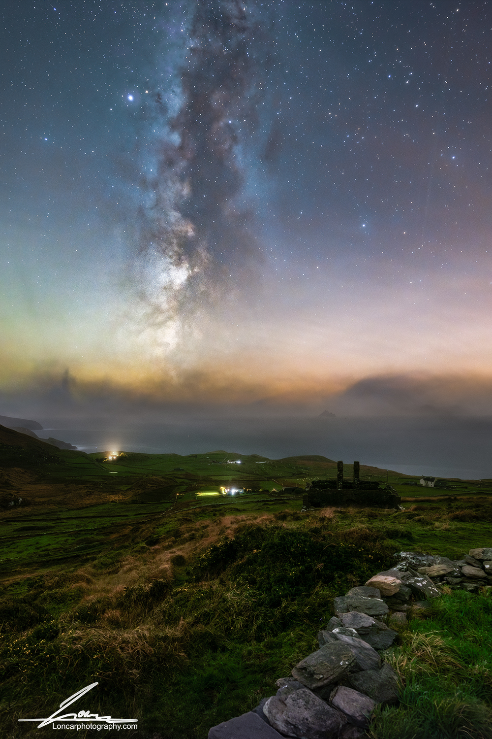 The galactic core stretches across the night sky as soft light from distant homes glows gently beneath the stars. Layers of mist and fading twilight create depth across the hills, blending earth and sky in one of the darkest and most protected night landscapes in Europe.