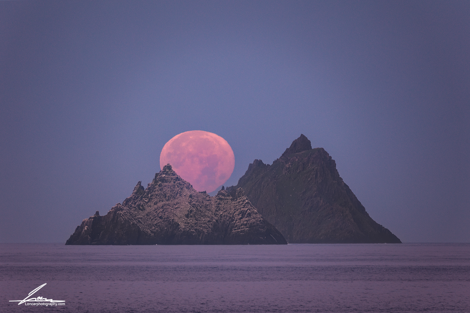 Skellig Michael Moonset fine art print capturing a dramatic moon descending behind the iconic Skellig Michael off the coast of County Kerry, Ireland.